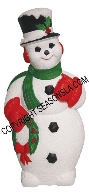 The 40" nicest looking Snowman on earth! He will put a smile on all those visiting your home for the Hoiliday. This plastic hollow painted decoration is illuminated with your 25w bulb. Lighting apparatus included. Buyer must supply 25w bulb. Limited to stock on hand. Size is approx.